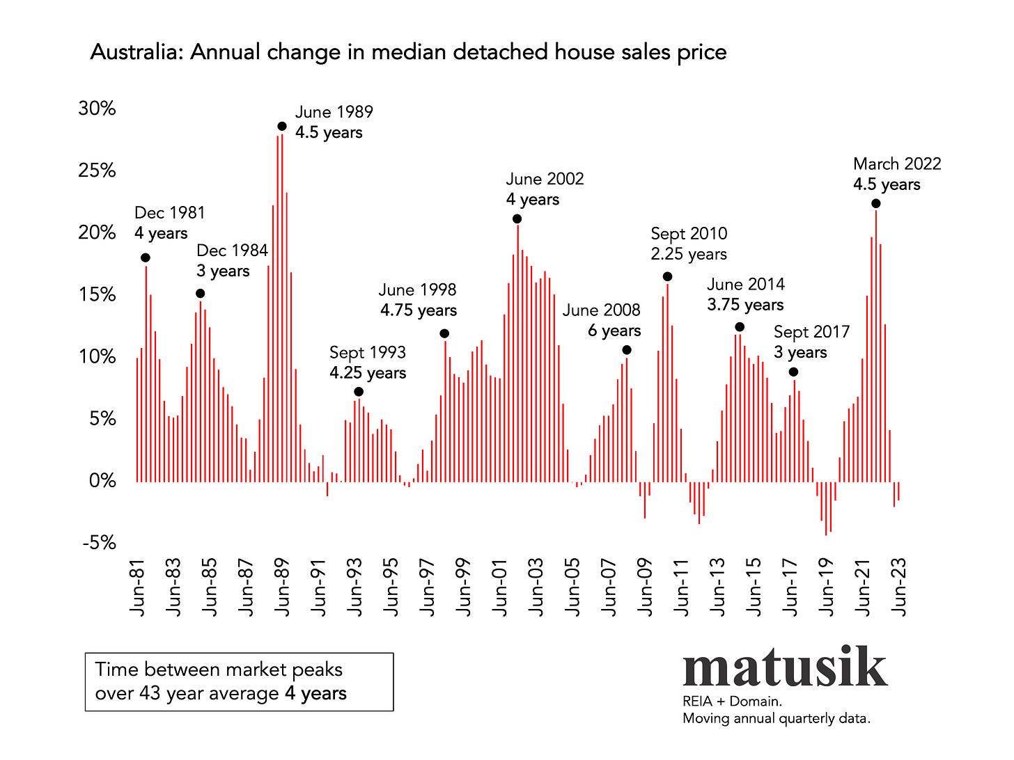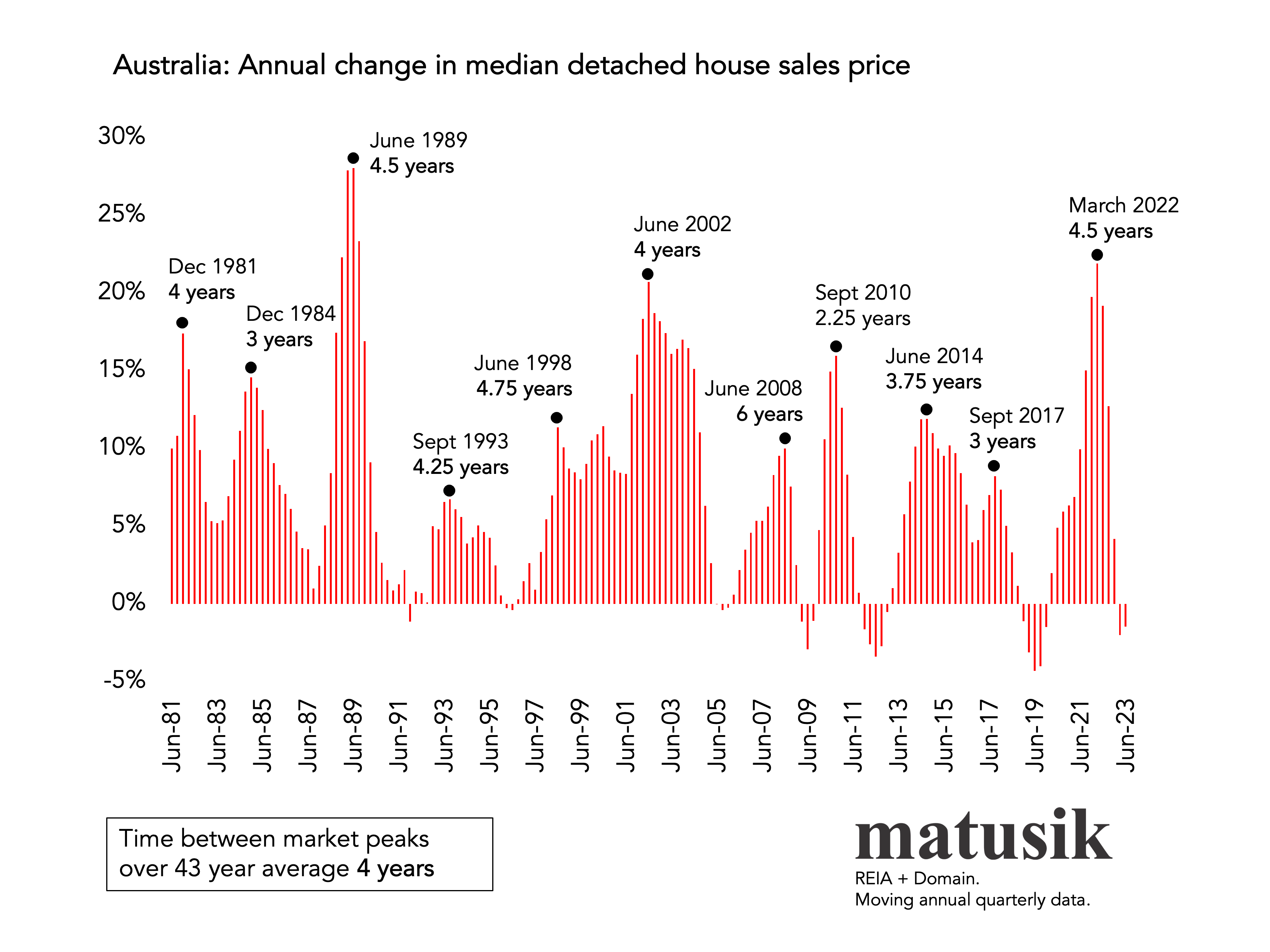Since 1980 the time between house price growth peaks is four (4) years and not the often quipped seven (7) years.