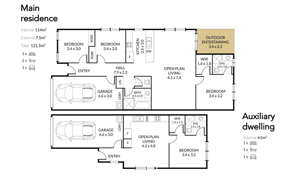 Typically, up to five bedrooms and between two and three cars (on site) are permitted in a dual-occupancy detached house; with the ancillary dwelling having one or two bedrooms.