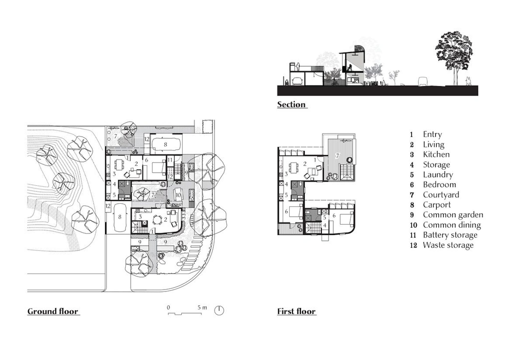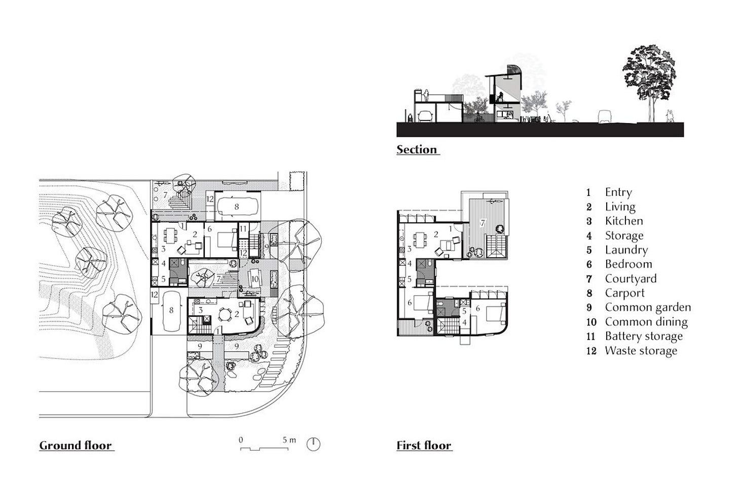 The second plan (and photograph) is something more ambitious, falling somewhere between a house and an apartment. This housing form allows several people to live together in a suburban setting.