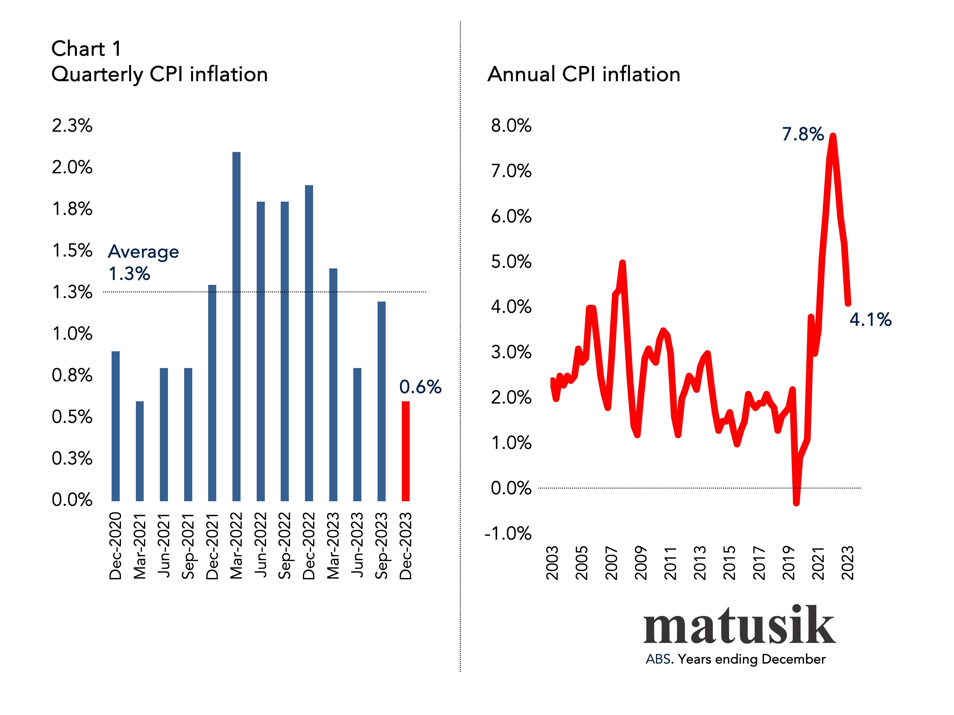 In Australia the December quarter consumer price index had dropped to 0.6% on a quarterly basis, and to 4.1%, on an annual clip. The domestic rate of inflation has halved over the past twelve months.