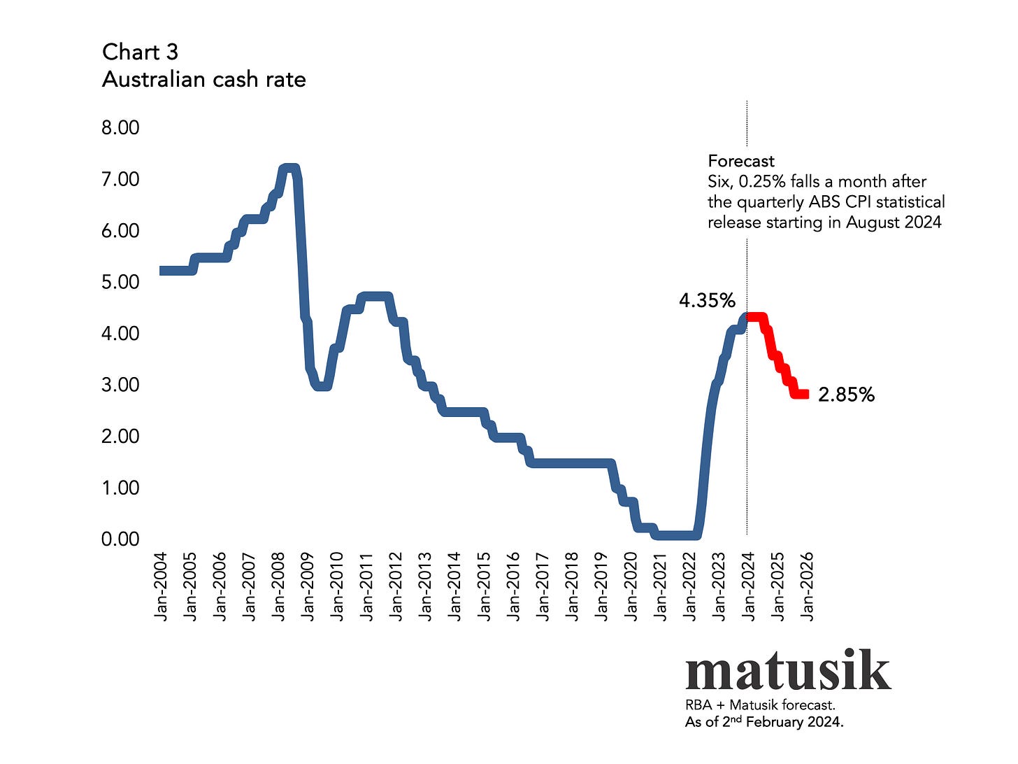 Our modelling – in conversation with independent property analyst Michael Matusik - suggests that six (6), 0.25% falls in the cash rate is possible between mid-to-late 2024 and by the end of calendar 2025.