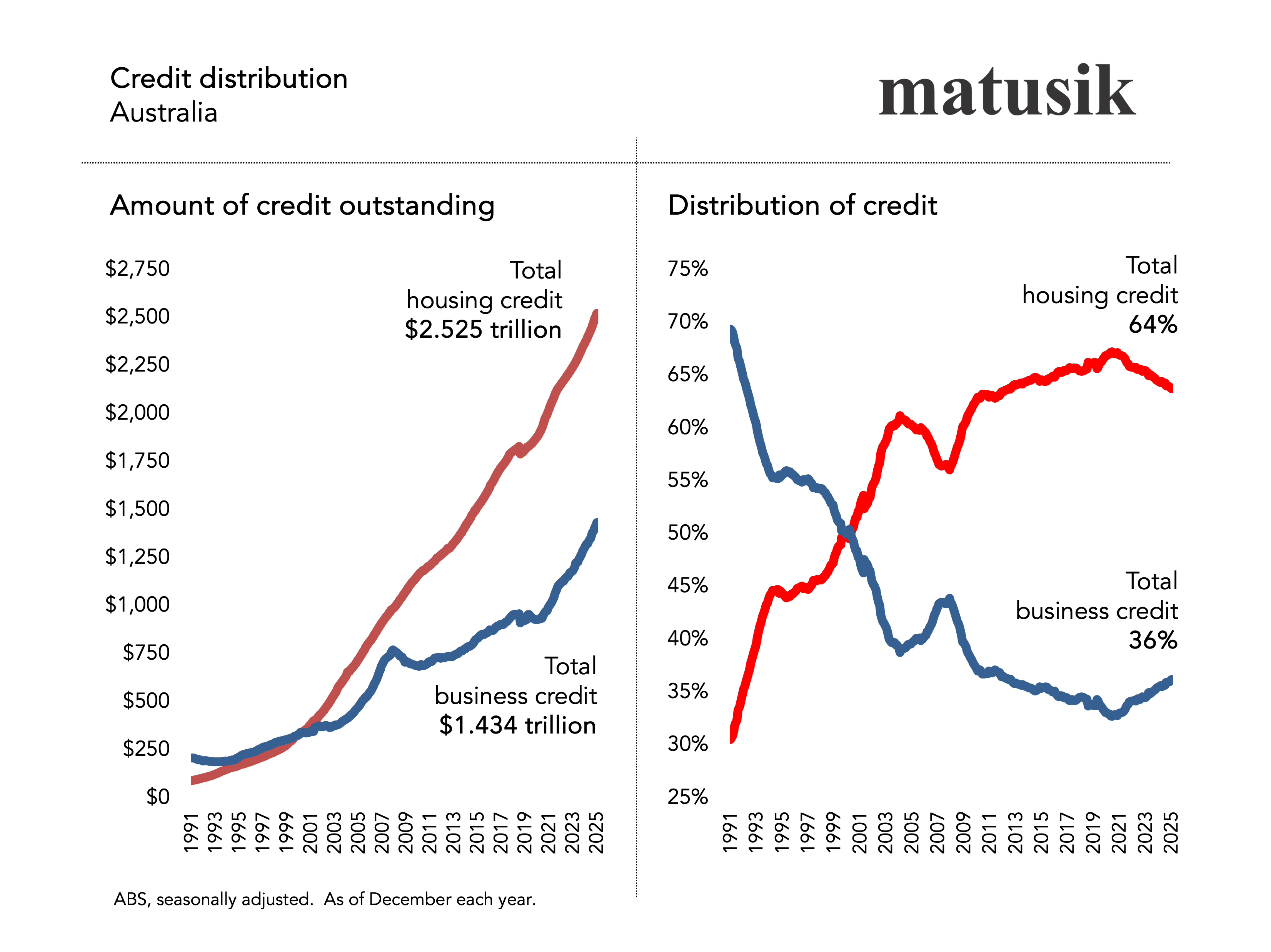 In the early 1990s, roughly half of domestic credit flowed to business and just over a third to housing. Today, more than 60% flows to housing and just over 30% to business.