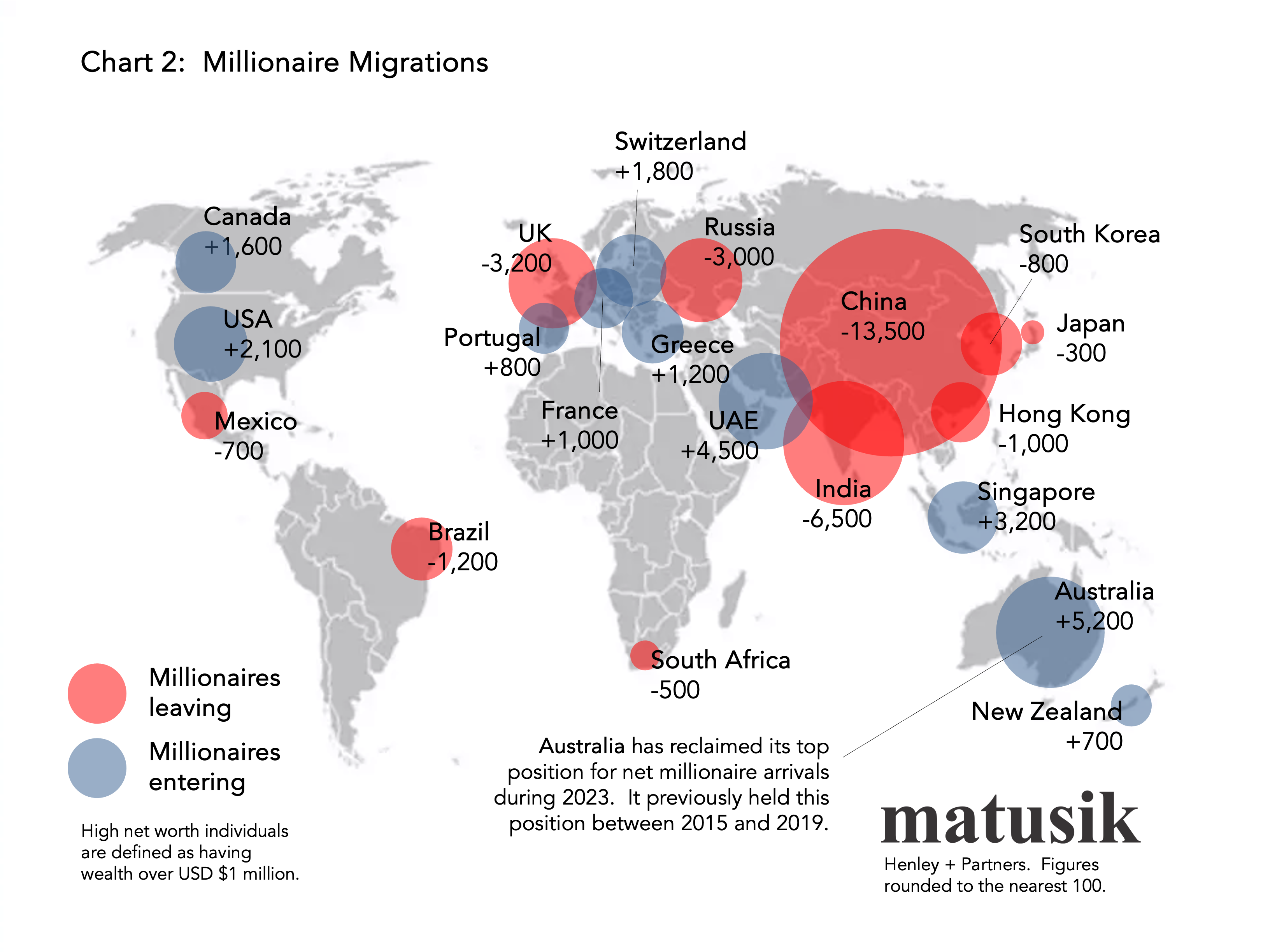 Last year, Australia reclaimed its position top position for net millionaire arrivals, with some 5,200 individual entries. The next highest was the United Arab Emirates with 4,500 such entrants.