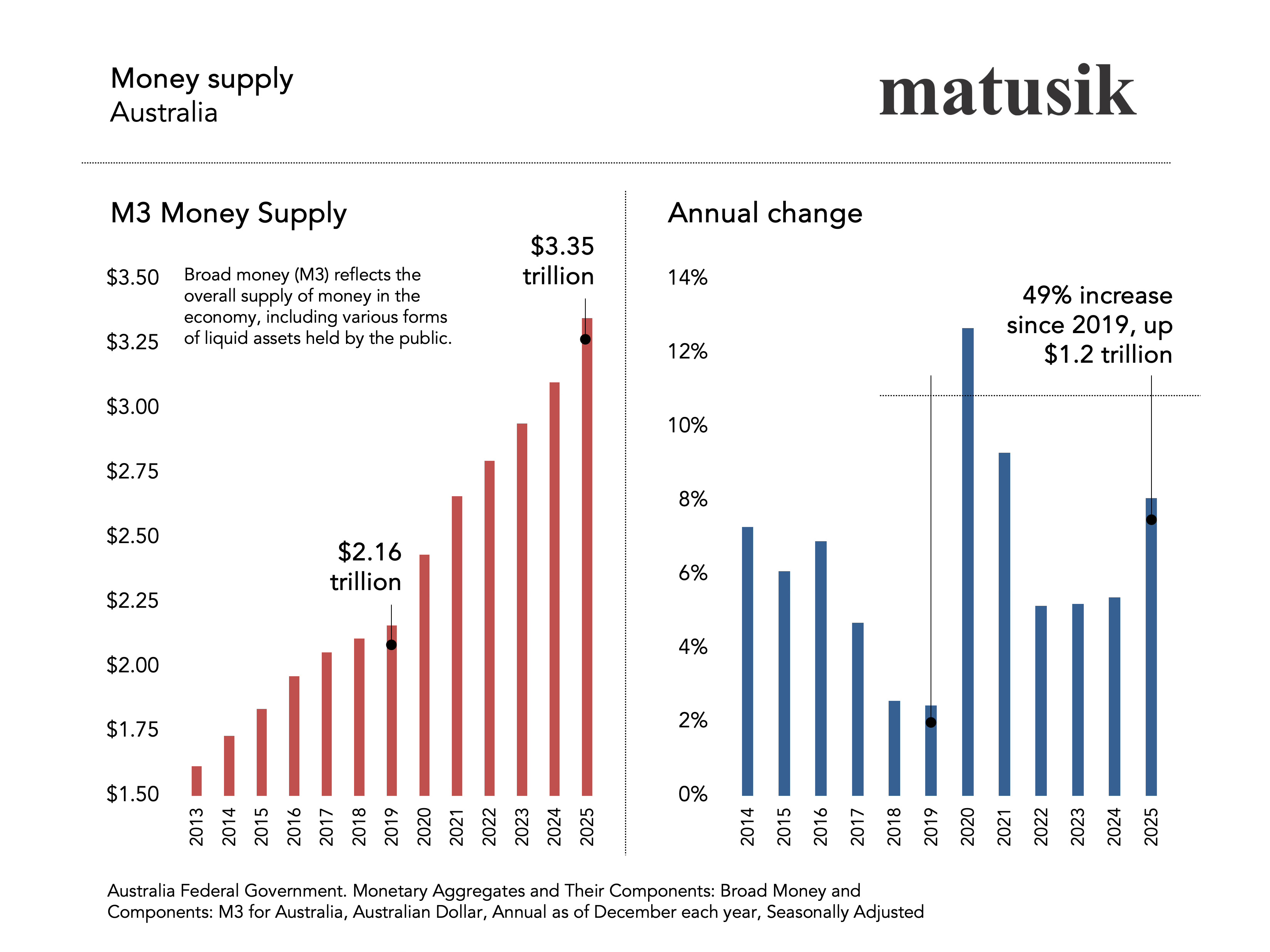 Over the same period, Australia’s broad money supply (M3) rose from around $2.16 trillion in 2019 to approximately $3.35 trillion today - an increase of roughly $1.2 trillion, or about 55%.