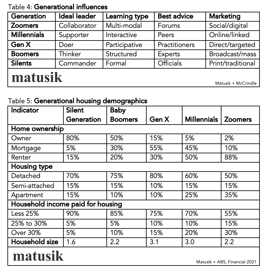 And finally, table 5, outlines some key housing demographics by generation cohort.
