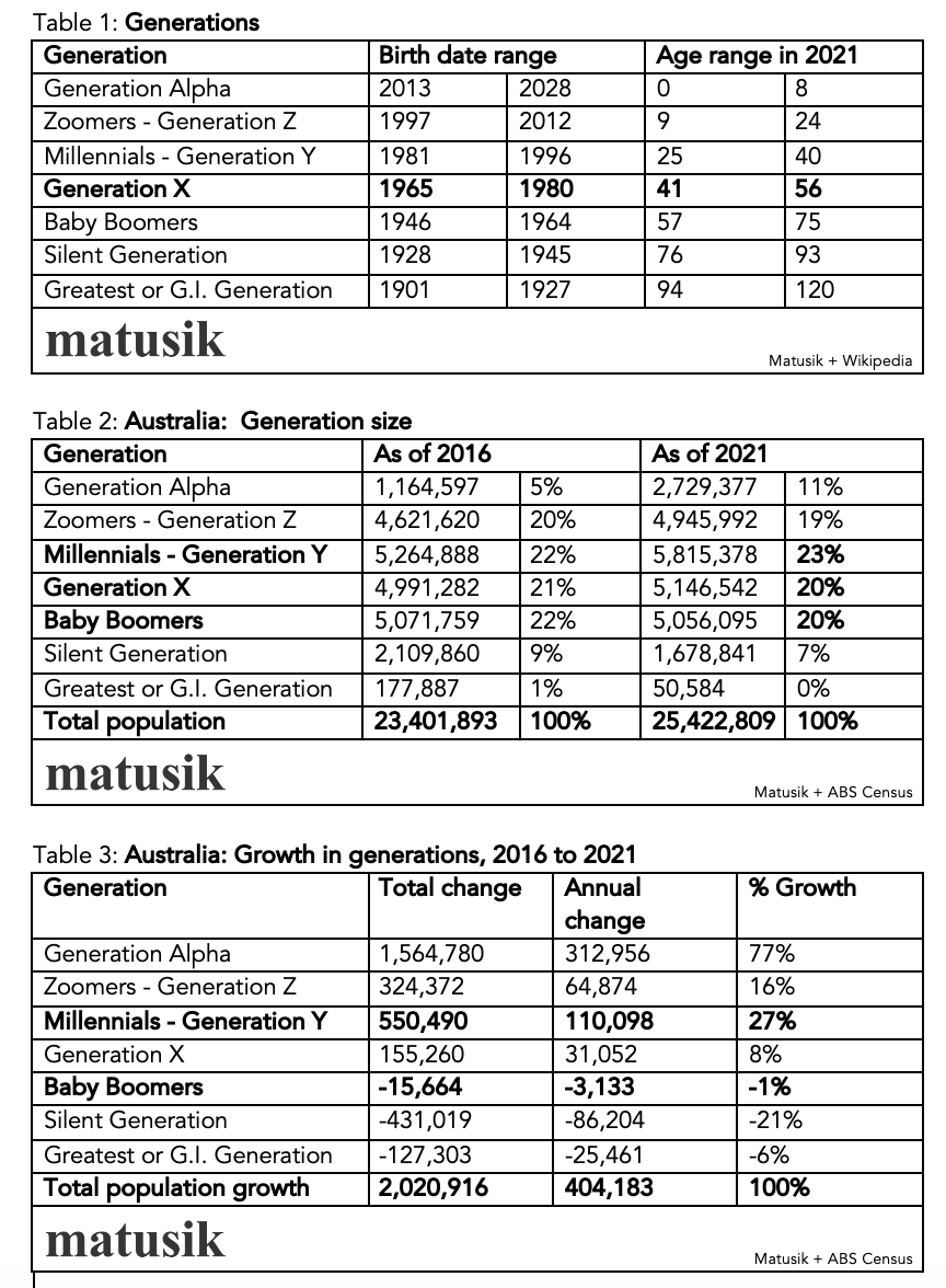 Table 2 shows that Millennials are now the largest generational segment in Australia with a 23% market share. Baby Boomers and Gen X hold 20% each.