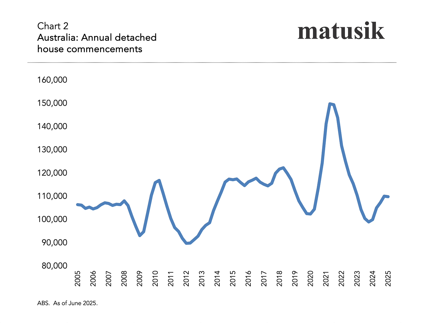 Australia has 11.4 million dwellings. Even in our absolute best years, we add new supply at 2–3 per cent — and even that happens only for a year or two at a time. Most years, the build rate sits between 1.5 and 2 per cent. That’s not a flood of new stock; it’s a trickle.