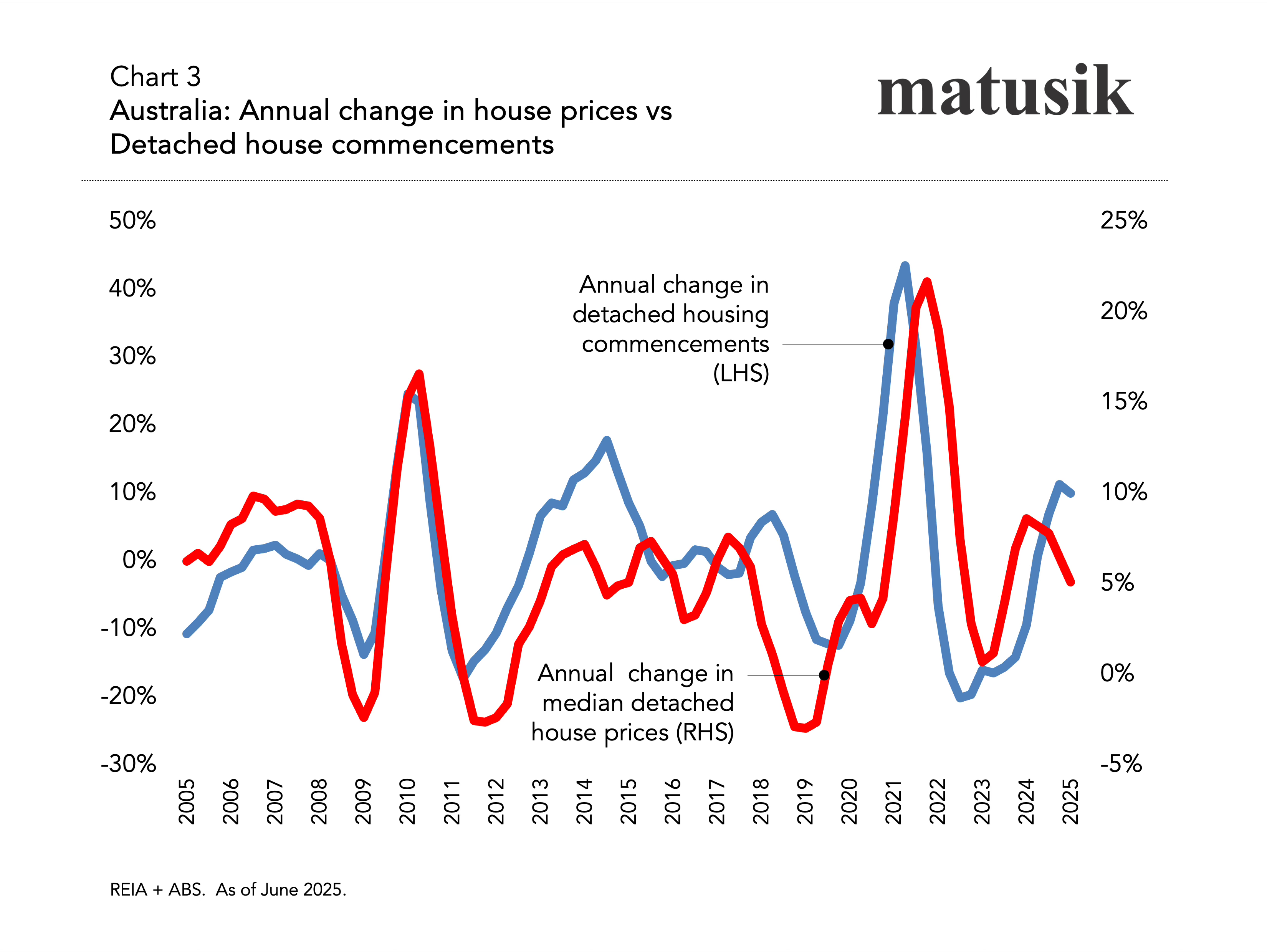 New detached homes sit at the top of the price tree. They reset expectations and lift comparable values of established dwellings. When fewer new homes complete, those benchmarks vanish. Without the “premium end” pulling values upward, price growth naturally softens.